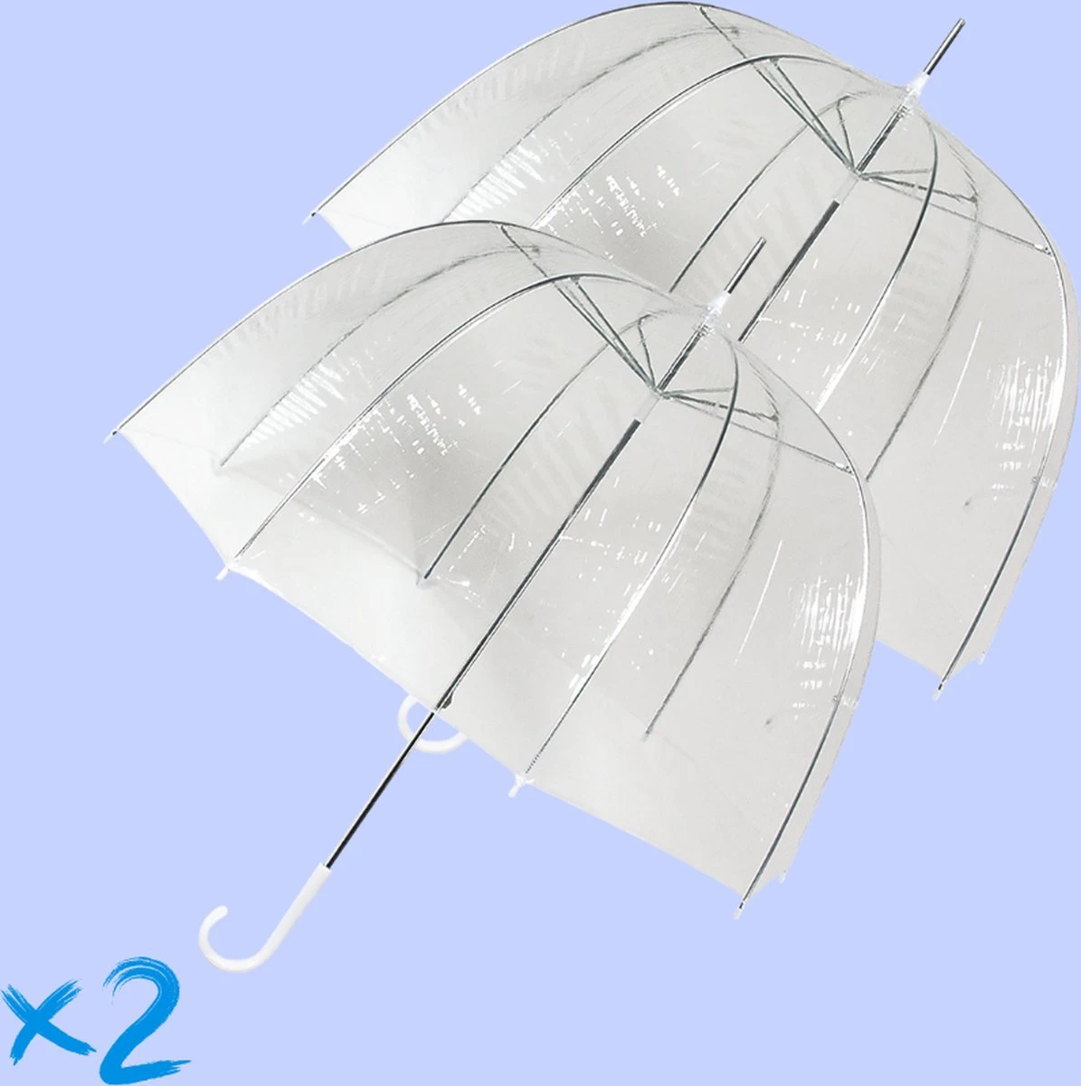 2x Transparante koepelparaplu. Een koepelparaplu in doorzichtige uitvoering. Diameter paraplu is ongeveer 75 cm. U ontvangt 2 stuks. Transparante paraplu’s zijn geschikt voor normaal gebruik. Daarnaast zijn deze paraplu’s zeer populair als trouw- of bruidsparaplu. Het witte handvat van de koepelparaplu heeft de vorm van een haak.