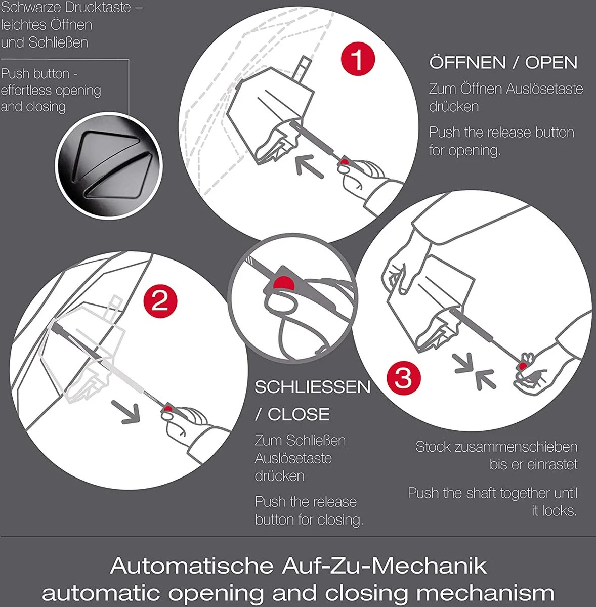 Knirps biedt een hoog bedieningscomfort dankzij het exclusief voor het merk ontwikkelde openingsmechanisme “Duomatic”. De rode drukknop is eenvoudig in gebruik en opent en sluit de paraplu automatisch .