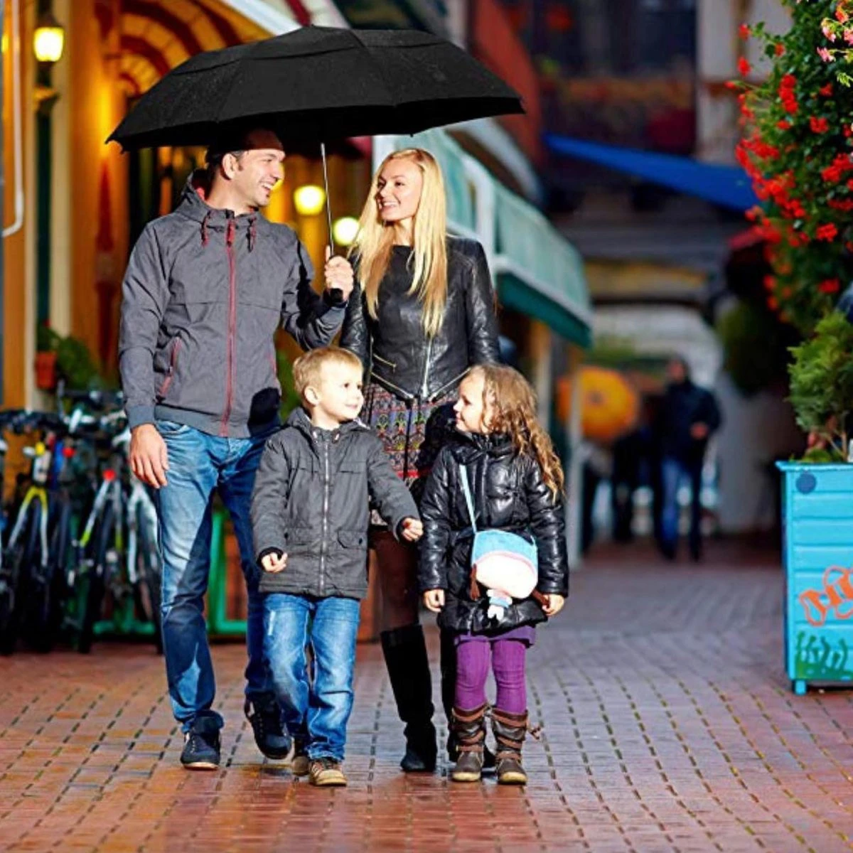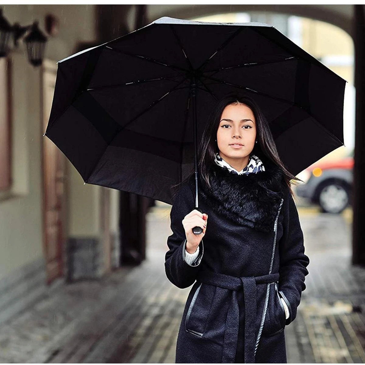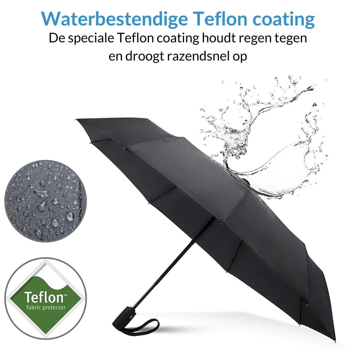 Met een druk op de knop open je de stevige paraplu automatisch. Je stapt het noodweer in. De sterke teflon laag zorgt ervoor dat je haar en kleding droog blijft. De unieke dubbele laag met opening laat de storm door zodat er amper kracht op jouw paraplu komt te staan.